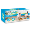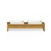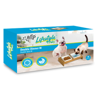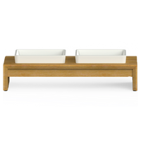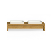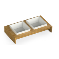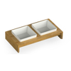 Complete set, bestaande uit een houten standaard en 2 keramische voer-/drinkbakjes