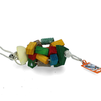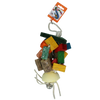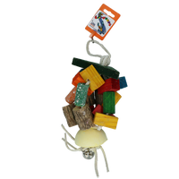 Houten speelgoed voor papegaaienDit vrolijk gekleurde speeltje van diverse stukjes hout is voorzien van leren touwtjes en een belletje. Voor urenlang speelplezier.