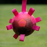 Deze hoogwaardige bal bestaat uit drie lagen en is daarom extreem sterk. De binnenste bal bestaat uit rubber en is beplakt met een katoenen laag, de buitenkant is van PU materiaal. Dit maakt de bal zacht en duurzaam en zorgt ervoor dat de bal goed stuitert. Veilig voor het gebit van de hond en vanwege de lussen perfect om te apporteren en te gooien. De bal wordt makkelijk opgepompt met de meegeleverde pomp.