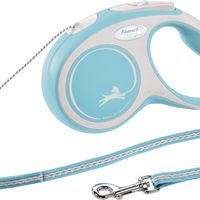 Flexi hondenriem New Comfort met een lengte van 5 meter. De riem heeft maat S wat betekent dat het voor honden tot 12 kg geschikt is. De kleur is lichtblauw met lichtgrijs. De vorm van de riem is een koord.