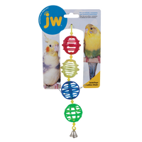Met dit kleurrijke speeltje hoeft uw parkiet zich nooit meer te vervelen! Deze keten bestaat uit vier doorschijnende hangende ballen met uitsparingen die kunnen worden gevuld met lekkernijen. Deze ballen zullen de aandacht van uw vogel trekken en hem stimuleren om dit speeltje te verkennen. Onderaan zal uw vogel een leuk belletje om mee te rinkelen vinden. Gemaakt van sterk kunststof.