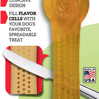 In tegenstellint tot de reguliere Flavorit botten is deze flexibel en ontworpen voor matige of zachte kauwers. Dit flex-bot heeft kleine gaatjes aan beide kant zodat u deze kunt vullen met de favoriete smeerbare lekkernij van uw hond. U zou er bijvoorbeeld pindakaas, smeerkaas, roomkaas, jam of andere smeerbare lekkernijen op kunnen smeren. Door middel van deze botten kunt u uw hond verwennen zonder dat uw hond te veel calorieën binnen krijgt.
