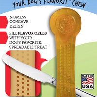 In tegenstellint tot de reguliere Flavorit botten is deze flexibel en ontworpen voor matige of zachte kauwers. Dit flex-bot heeft kleine gaatjes aan beide kant zodat u deze kunt vullen met de favoriete smeerbare lekkernij van uw hond. U zou er bijvoorbeeld pindakaas, smeerkaas, roomkaas, jam of andere smeerbare lekkernijen op kunnen smeren. Door middel van deze botten kunt u uw hond verwennen zonder dat uw hond te veel calorieën binnen krijgt.