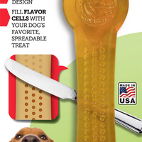 In tegenstellint tot de reguliere Flavorit botten is deze flexibel en ontworpen voor matige of zachte kauwers. Dit flex-bot heeft kleine gaatjes aan beide kant zodat u deze kunt vullen met de favoriete smeerbare lekkernij van uw hond. U zou er bijvoorbeeld pindakaas, smeerkaas, roomkaas, jam of andere smeerbare lekkernijen op kunnen smeren. Door middel van deze botten kunt u uw hond verwennen zonder dat uw hond te veel calorieën binnen krijgt.