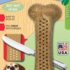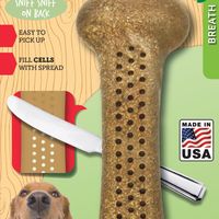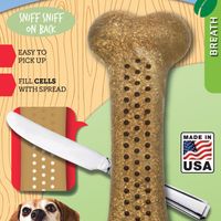 Gebogen boomschors botten. Dit bot heeft kleine gaatjes aan beide kanten zodat u deze kunt vullen met de favoriete smeerbare lekkernij van uw hond. U zou er bijvoorbeeld pindakaas, smeerkaas, roomkaas, jam of andere smeerbare lekkernijen op kunnen smeren. Door middel van deze botten kunt u uw hond verwennen zonder dat uw hond te veel calorieën binnen krijgt. Voor een grondige reiniging kunt u het bot in de vaatwasser doen. Zo is het bot snel ontdaan van overgebleven etensresten.