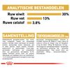 Analytische bestanddelen ruw eiwit 30,0 % ruw vet 13,0 % ruwe celstof 3,6 % ruwe as 6,6 %calcium 1,01 %fosfor 0,82 %magnesium 0,08 %arachidonzuur 0,08 %vitamine B8 (biotine) 2.98 mgchloride 0,69 %choline2,5 mgchondroïtine en glucosamine 1,22 mgijzer 216,0 mgsap 9,5 %vitamine B9 (foliumzuur) 13,2 mgiodine 3,4 mgkalium 0,7 %koper 10,0 mgL-carnitine 200,0 mglinoleenzuur 2,53 %mangaan 65,0 mgnatrium0,4 %vitamine B3 (niacine) 470.0 mgomega-3 vetzuren 0,71 %omega-6 vetzuren 2,74 %vitamine B5 (pantotheenzuur) 140,8 mgvezels 9,9 %selenium 0,32 mgzetmeel31,0 %taurine3,5 mg/kgzink 235,0 mgvitamine A 33,0 IEvitamine B1 (thiamine) 26,2 mgvitamine B12 (cobalamine) 0,13 mgvitamine B2 (riboflavine) 47.2 mgvitamine B6 (pyridoxine) 73,5 mgvitamine C (ascorbinezuur) 300,0 mgvitamine D3 800,0 IE/kgvitamine E 600,0 mgmetaboliseerbare energie 3.629 kcal voedingsvezels 9,9 %polyfenolen 150,0 mgEPA + DHA vetzuren 0,4 %luteïne 5,0 mg