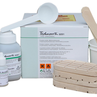 Technovit is een snel hardende kunststof welke ontstaat na het vermengen van poeder en vloeistof in bijgeleverde mengbekers. De massa goed doorroeren, na 3 minuten kunnen de blokjes aan de gezonde klauw bevestigd worden.