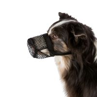 Met de muilkorf kunt u nog steeds happen, snuffelen en drinken. Hij kan ook gebruikt worden om traktaties te geven dankzij de openingen in de zijkanten. De elastische inzet en verstelbare nekriem zorgen voor een goede pasvorm. De muilkorf is gemaakt van polyester.