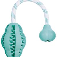 Trixie Denta Fun Jumper On Rope Mintfresh Natuurrubber 28 cm De Trixie Denta Fun Jumper On Rope Mintfresh Natuurrubber 28 cm is een leuk hondenspeeltje met mintsmaak dat tijdens het spelen het gebit verzorgt. Zo maakt u het spelen met uw hond leuk en nuttig! Deze Denta Fun Jumper bestaat uit een touw met aan elk uiteinde een natuurlijk rubberen deel. De bal aan het ene uiteinde zorgt voor een goede en pijnloze grip voor de eigenaar. Dit maakt de Denta Fun Jumper leuk om alleen of samen mee te spelen. Het rubber heeft een heerlijke muntsmaak en de uitgekiende structuur masseert het tandvlees en verzorgt het gebit tijdens het spelen, doordat het materiaal tegen de tanden wrijft en bacteriën helpt te verminderen. Zo kan samen spelen nog heilzamer zijn! - Trixie- Natuurlijk rubberen speeltjes aan een koord met een rubberen bal aan één uiteinde voor een goede grip, ideaal om samen mee te spelen- Met een lekkere muntsmaak- Helpt bij het tandvlees en de tanden.Specificaties
