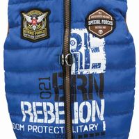 De jas heeft een stoere look, met een militaire print en een leuke rits in het midden. Hij is gemaakt van polyester en komt in een coole blauwe kleur.