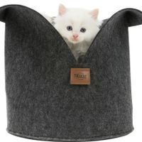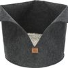 Trixie Kattenmand Luise Rond Vilt Antraciet 30 x 30 cmDe Trixie Kattenmand Luise Rond Vilt Antraciet 30 x 30 cm is een originele, stijlvolle kattenmand van vilt in donkergrijs, met omkeerbaar kussen van langharig pluche. Deze leuke mand is een aanwinst voor uw interieur en uw kat! De mand heeft een ronde vorm en is aan de voorkant 'uitgevouwen', zodat uw kat gemakkelijk in en uit de mand kan en zich toch veilig en geborgen voelt. De buitenkant van de mand is gemaakt van vilt, wat hem niet alleen comfortabel maakt, maar ook goed isoleert. Binnenin de mand zit een omkeerbaar kussen, dat een fleece vulling heeft en aan de ene kant gemaakt is van langharig pluche en aan de andere kant van geweven stof. Het bruine Trixie lederlook label maakt het af en geeft deze mand een stijlvolle uitstraling die in elk interieur past.