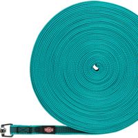 Trixie Leash Turquoise 15 m x 1,5 cm De Trixie Leash Turquoise 15 m x 1,5 cm is een lange riem gemaakt van webbing met rubber voor meer grip, zonder handlus. Met deze 5 meter lange riem heeft uw hond alle ruimte om te rennen. De riem kan gebruikt worden in de tuin, maar door de rubberen anti-slip voering ook tijdens het wandelen. De riem wordt geleverd zonder handlus en eindigt in een musketonhaak - Lange riem voor de hond - Vijftien meter lang - Met rubber voor meer grip - Zonder handlusMaten: 15 meter x 1,5 cmSpecificaties
