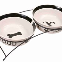 Trixie Voer- / Drinkkommenset Eat On Your Feet wit /zwart 2 x 2,6 l / 25 cmDe Trixie Voer- / Drinkkommenset Eat On Your Feet wit /zwart 2 x 2,6 l / 25 cm bestaat uit twee keramische kommen in slipvaste metalen standaard. Deze set is niet alleen handig maar ziet er ook nog eens geweldig uit in uw huis. De set bestaat uit twee witte kommen met zwarte accenten: de ene voerbak heeft een opdruk op de zijkant 'water' en de andere 'voer', met een overeenkomstige afbeelding op de bodem, namelijk een bot en een kraan. Aan de binnenzijde loopt een zwarte rand, die mooi aansluit bij de vorm van de zwarte, metalen houder. Deze is gebogen voor een chique uitstraling en voorzien van antislip rubberen voetjes. Zo kan uw huisdier rustig eten zonder dat de bakjes heen en weer schuiven.Specificaties