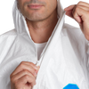 Deze disposable overall van sterk Tyvek biedt een goede combinatie op gebied van bescherming, duurzaamheid en comfort. Beschermt tegen vloeistofnevels van chemicaliën op waterbasis en vaste deeltjes. Beperkte bescherming tegen vloeibare chemicaliën. Elastieken in de capuchon en de manchetten bij de polsen/enkels zorgen voor een goede afsluiting. Voorzien van rits met overslag voor optimale bescherming.