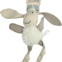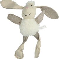 Dit knuffelkonijn is gemaakt van superzachte fleece en duurzaam en sterk canvas. Dubbel gestikt en met een pieper voor extra speelplezier. Met grote oren om mee te kunnen gooien en voor trek-spelletjes met uw hond. De benen zijn van geknoopt canvas en onderin de voeten zit nog een extra pieper.
